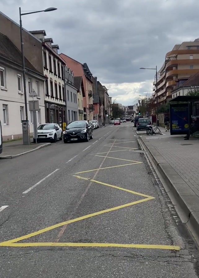 The video presents a medium shot of a street lined with buildings on either side under a heavily overcast sky. The road is marked with yellow zigzag lines, indicating a no-parking zone. Cars are parked intermittently along the left side of the street, with several cars driving along the road. The buildings vary in style, some appearing older with traditional architectural features, while others are more modern apartment blocks. There are street lights positioned along the sidewalk on both sides. A bus stop is visible on the right sidewalk, with a person seated inside. There are pedestrians visible on the right sidewalk near the bus stop.