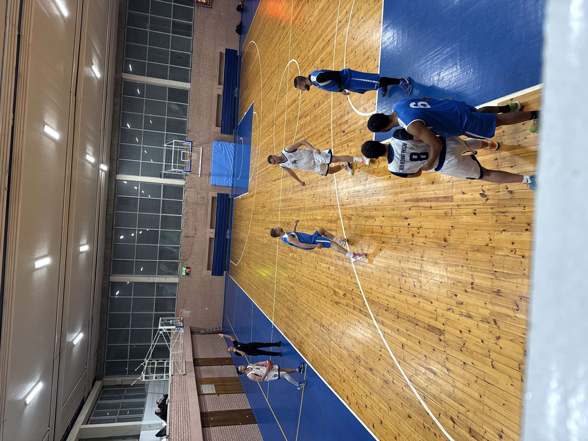 The image captures a basketball game in progress on an indoor court. The court has a wooden floor with blue-painted borders. Several players wearing blue and white uniforms are engaged in the game. One player in a white uniform is advancing with the ball. The court is well-lit with overhead fluorescent lights. Large windows line one side of the court. A scoreboard is visible on the wall. Spectators are present in the background near one of the baskets. Based on text on the uniform of one of the players, it is highly probable that the location is in the city of Sofia, Bulgaria.