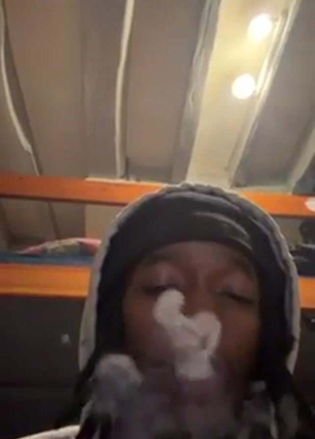 man with dreadlocks wearing a grey hoodie and a black beanie taking a hit from a vape pen. He exhales a large cloud of vapor, which obscures the camera's view momentarily. The video is shot from a low angle, looking up at the man. The background appears to be the interior of a room with a bunk bed. Two ceiling lights are visible.
