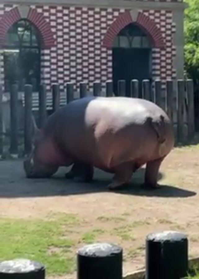 hippopotamus in an enclosure at a zoo. The hippo is large and has a brownish-grey, wet-looking skin. It stands on a sandy and grassy area, eating with its head lowered. A fence of vertical wooden slats separates the hippo from the viewer. In the background, a building with a red-and-white checkered pattern on the upper half is visible, featuring arched windows and a doorway. There are black, cylindrical posts along the edge of the viewing area. Sounds of people speaking can be heard in the background.