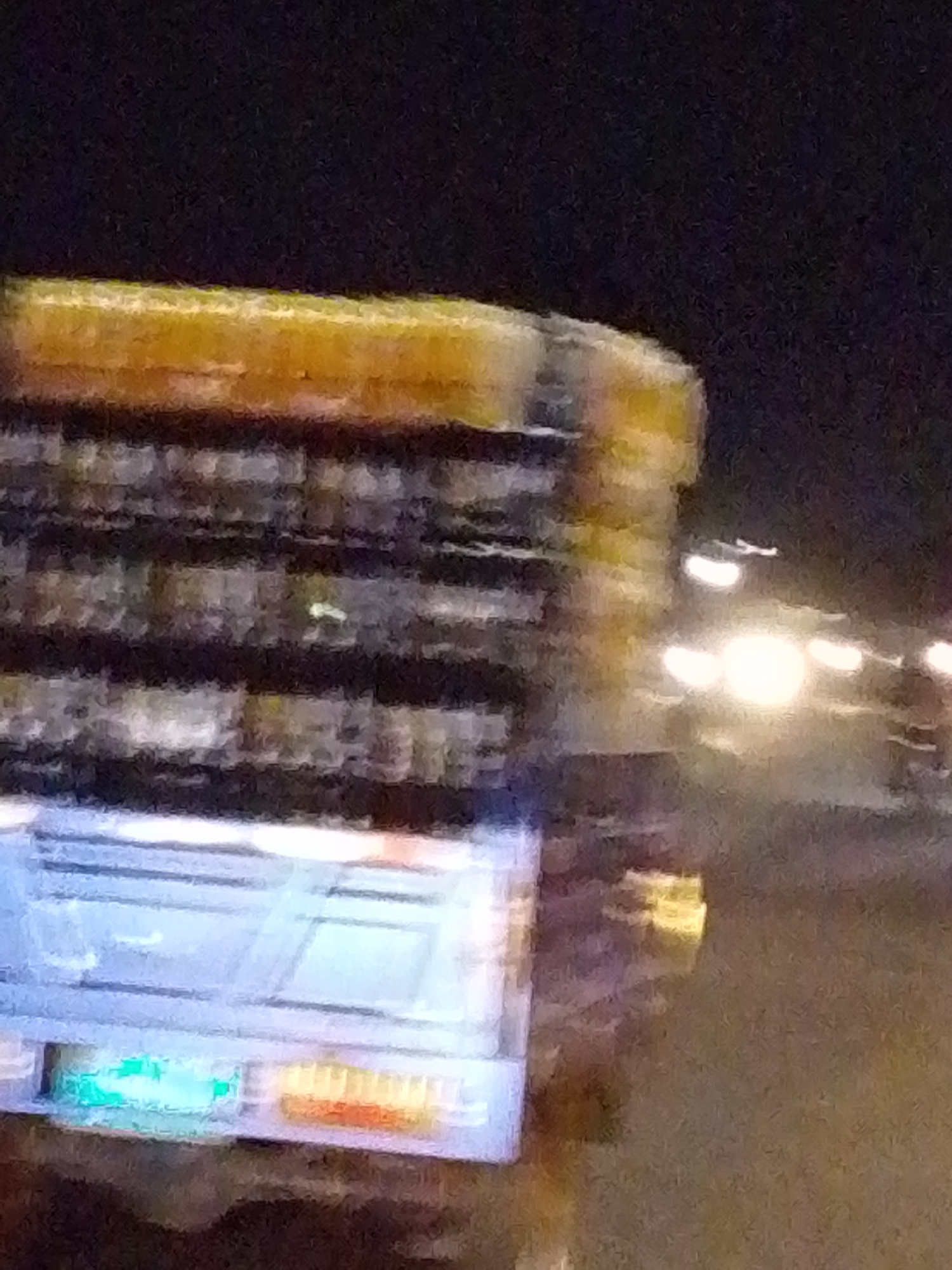blurry nighttime scene in Tamale, Ghana. The primary subject is the rear of a truck loaded with goods, possibly produce, though the exact nature of the goods is unclear due to the blur. The truck has a pale blue tailgate with indistinct markings. Its rear lights are visible, with a green light on the left and a yellow/orange light on the right. The surroundings are dark, with headlights from other vehicles in the background. The overall environment appears to be urban. The image has a grainy quality, indicative of low light conditions or motion blur. There are no visible people.