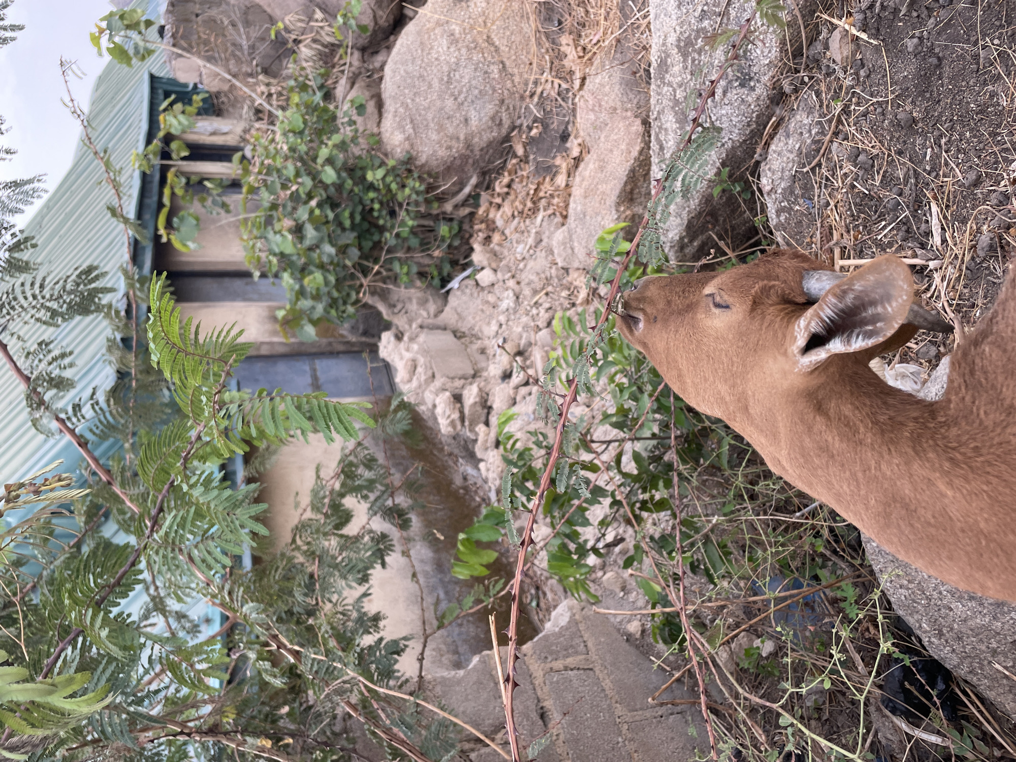A close-up, tilted, eye-level shot shows a brown goat eating vegetation in an area with rocky terrain and some man-made structures, possibly in Jos, Nigeria