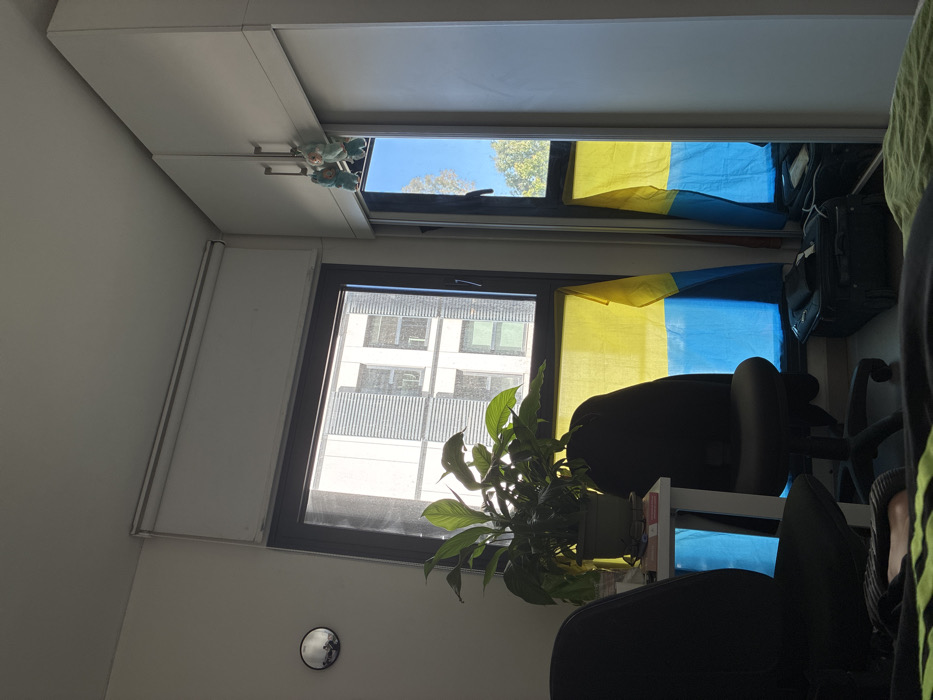 An interior room in Herzliya, Israel, is depicted in daylight, illuminated primarily by natural light from two windows. On the left, a large rectangular window offers a view of a modern building featuring horizontal architectural elements. To the right of this, a second, narrower window is partially obscured by a white wardrobe. The lower half of both windows is draped with a Ukrainian flag, displaying horizontal blue and yellow stripes. In the center of the room, positioned before the main window, sits a potted plant with dark green leaves on a small white desk. Two dark office chairs with casters are situated in front of the desk; one is pulled closer to the desk, while the other is slightly further back. On the far right, a white wardrobe with two silver handles has two light-colored plush keychains or figures hanging from its handles. A dark, wheeled suitcase rests on the floor beneath the right window. A small, circular convex mirror is affixed to the wall on the upper left. The very bottom of the image reveals a portion of a bed with green bedding, and a bare foot or ankle is visible on the bed in the lower-left corner.
