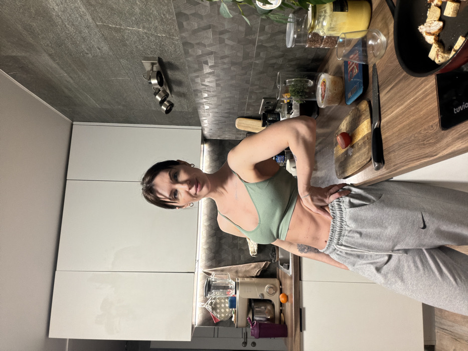 An adult female, positioned centrally, is depicted in a modern kitchen. She faces the viewer, exhibiting a slight smile. Her dark hair is pulled back, and she is attired in a light green ribbed sports bra and grey sweatpants featuring a black Nike logo on the left thigh. Her midsection displays visible abdominal muscle definition. Her left hand rests on her hip, while her right forearm is placed on the countertop. The kitchen environment includes white, glossy upper cabinets, a dark grey backsplash with a subtle geometric pattern, and dark grey plain tiles on the upper wall. Undercabinet lighting illuminates the countertop area. A brushed metallic light fixture with three adjustable spotlights is mounted on the upper wall. The wooden-effect countertop holds various items: a purple shaker bottle, a beige stand mixer with a glass pitcher, a small orange fruit, and a white kitchen towel on the left. To the right, a clear glass pitcher containing green herbs, a wooden cutting board with a halved red tomato, and a black-handled knife are present. In the immediate foreground, a red frying pan rests on an induction cooktop, containing cubed pieces of chicken and tofu actively cooking. Further right on the countertop are a small clear glass bowl, a clear jar containing seeds, and another clear jar with a yellow substance. A green leafy plant is partially visible on the far right. The precise location within Perm, Russia, cannot be determined from the visual information provided.