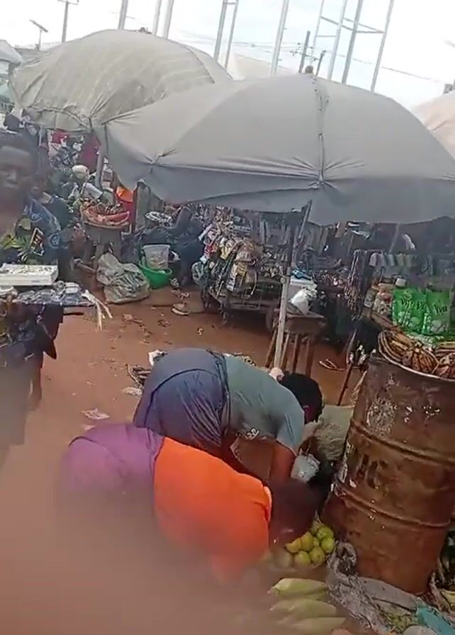 bustling outdoor market. Several people are visible, browsing and interacting with vendors. Goods for sale include fresh produce like corn, lemons, tomatoes, and onions, as well as items like jewelry, clothing, and sandals. The vendors are under large umbrellas. The ground is dirt, and the overall atmosphere seems lively and crowded.