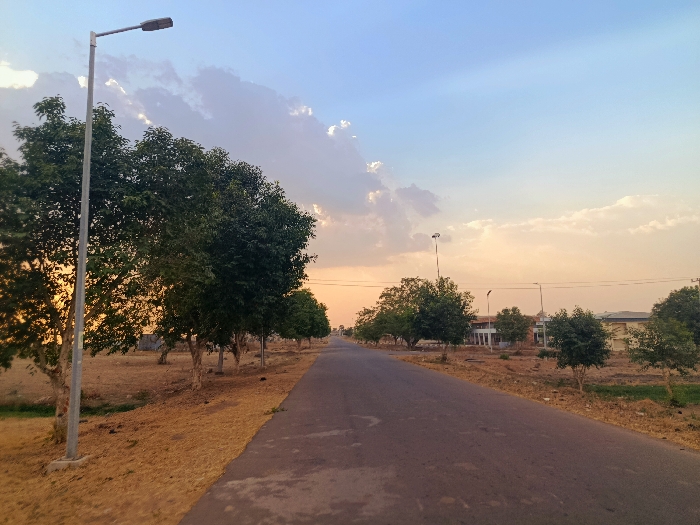 The image displays an empty, paved road extending into the distance under a late afternoon or early evening sky in Unknown, Nigeria. In the foreground on the left, a tall, grey metal streetlamp with an LED luminaire stands vertically. A row of green-leafed trees lines the left side of the road, which is dark grey asphalt exhibiting minor surface irregularities. The ground surrounding the road is dry, reddish-brown earth with sparse, desiccated vegetation. On the right side of the road, further rows of trees are visible, behind which several multi-story buildings with light-colored facades are discernible in the mid-ground. Additional streetlamps are present further along the road on the right. The sky exhibits a gradient from light blue at the zenith to warm orange and yellow hues near the horizon, with scattered clouds that show illuminated edges. No people, vehicles, or animals are present in the scene, and no actions or interactions are depicted.