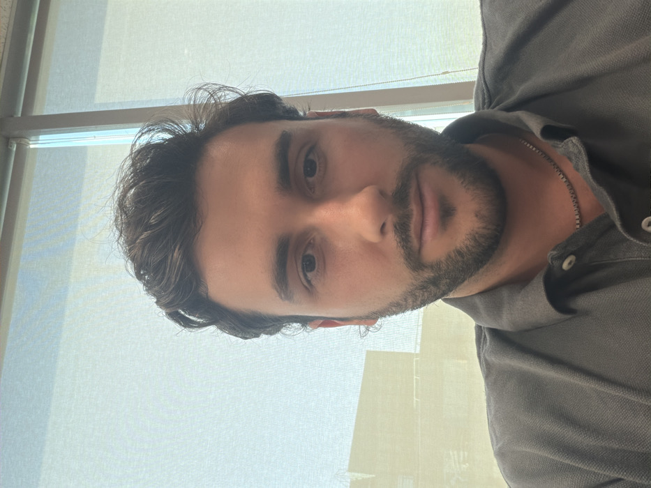 The image depicts a single adult male subject indoors, positioned directly in front of a window. The window is largely covered by light-colored, semi-translucent roller blinds, which diffuse the incoming daylight. The male has dark, wavy hair, a neatly trimmed beard and mustache, and is wearing a dark grey collared polo shirt with the top two buttons unfastened, revealing a thin silver-colored chain around his neck. His gaze is directed forward, towards the camera. Through the translucent blinds, a faint outline of an exterior urban environment is discernible. On the left side, a multi-story building with a light-colored facade and visible horizontal architectural elements can be seen. On the right side, a vertical white window frame or column is visible. This urban architectural context is consistent with modern commercial or residential areas within Santiago, Chile. However, the lack of specific, identifiable landmarks through the obscured window prevents a precise determination of the exact street or neighborhood within the city.