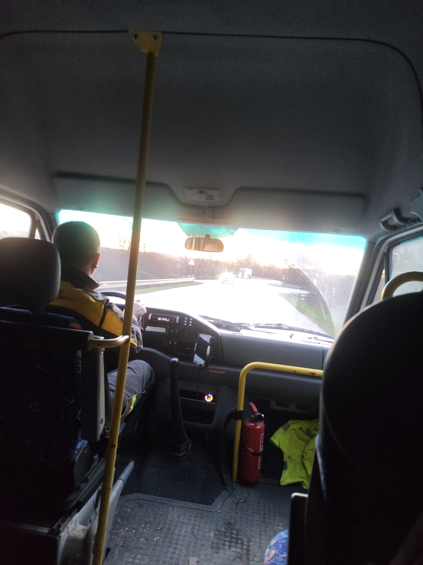 The image captures the interior of a vehicle, likely a van or small bus, viewed from a rear passenger seat looking forward towards the driver and the road ahead in Žákava, Czechia. A male driver, seen from behind, occupies the driver's seat, wearing a dark jacket with prominent yellow sections on the shoulders and back. His hands are positioned on the steering wheel, indicating he is operating the vehicle. Bright, low-angle sunlight, suggestive of sunrise or sunset, floods through the windshield, creating a glare over the road ahead where other vehicles are visible in the distance on a multi-lane thoroughfare flanked by trees. Inside the vehicle, a yellow vertical pole extends from the floor to the ceiling in the central foreground, serving as a support or grab handle. The dashboard features a radio/audio unit and various controls. A red fire extinguisher is securely mounted to the floor in the passenger footwell area, adjacent to a crumpled yellow high-visibility vest or garment. The vehicle's floor is covered with a black, ribbed mat. A portion of a dark passenger seat headrest is visible on the far right of the frame.