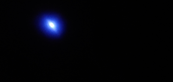 In a field of solid black, a bright blue and white light dominates the upper left corner