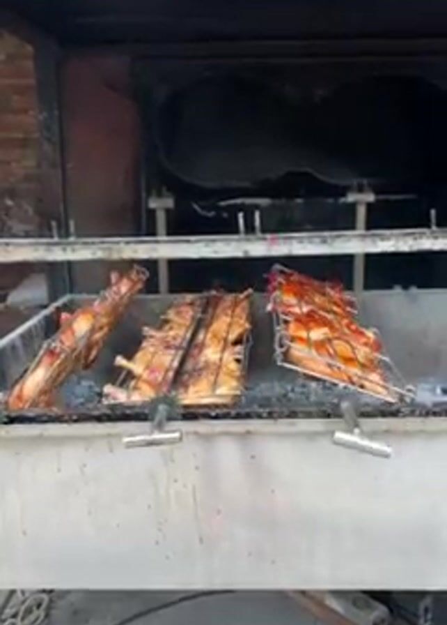 several chickens roasting in a large, open-front grill. The chickens are skewered and held in wire racks, positioned over what appears to be hot coals. The grill's interior is dark, with visible brickwork on one side. Steam or smoke rises from the cooking chickens.