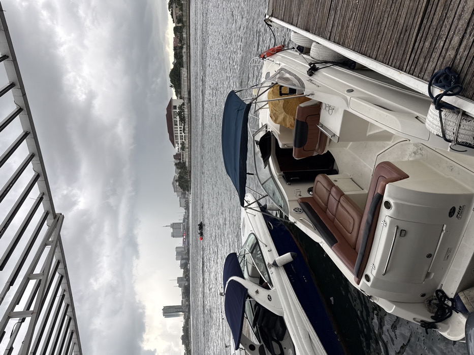 The image captures a marina scene in Lagos, Nigeria, under an overcast sky. The perspective is from beneath a white slatted pergola structure. In the foreground, two recreational powerboats are docked at a wooden pier. The boat on the right, cream-colored, features brown upholstered seating, a dark blue bimini top, and a yellow tarp covering an item within its cockpit. It is secured to the pier with dark ropes and protected by white boat fenders, including a stacked tire fender. A second boat, white with a dark blue hull stripe and a dark blue bimini, is partially visible to the left. The water body is a dark grey-green, exhibiting minor surface ripples. In the mid-distance, a small, dark personal watercraft is in motion, leaving a visible wake, with a red buoy floating nearby. The opposite bank features a large, multi-story building with a white facade and a prominent reddish-brown roof, surrounded by walls and various trees, including palm trees. To the left of this structure, the distinct urban skyline of Lagos is visible, comprising several high-rise buildings. The sky is uniformly overcast with dense grey clouds, indicating a cloudy day, possibly with recent or impending rain. No individuals are discernible in the immediate foreground or on the pier.