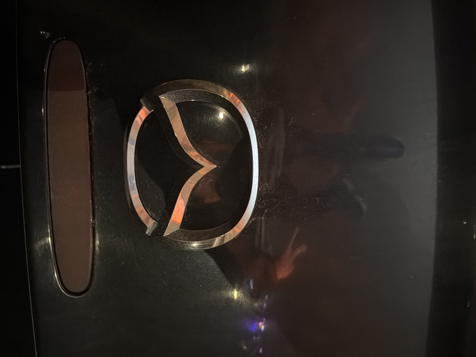 The image displays a close-up, downward-angled view of the rear of a dark-colored vehicle, likely black or dark gray, situated in Balchik, Bulgaria, under low light conditions consistent with nighttime. A chrome Mazda emblem is centrally affixed to the vehicle's surface, reflecting various ambient light sources, prominently featuring orange and white hues. Directly above the emblem, a horizontal, oval-shaped recessed area, consistent with a housing for license plate lights, appears dark red or brown due to reflected light. The vehicle's paint surface exhibits a visible layer of dust, smudges, and fine scratches. Distorted reflections are evident across the glossy surface: in the lower left quadrant, a reflection consistent with an individual, possibly holding a mobile device, is visible, alongside a blurred cluster of multi-colored background lights (blue, purple, white). A faint reflection resembling a person's head and torso is also discernible within the upper part of the Mazda emblem. In the lower-central right area, a subtle, elongated, dark reflection could be interpreted as a small animal. No direct actions or interactions between individuals or animals are clearly depicted; their presence is solely indicated by these surface reflections.