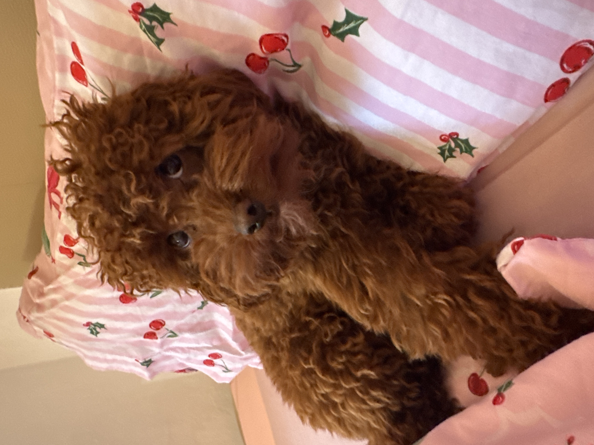 A brown, curly-haired dog, consistent with a poodle or poodle mix, is depicted lying on a bed in an indoor setting. The dog's head is slightly tilted, and its dark, round eyes are focused directly towards the viewer. Its nose is black. The animal is resting on a pillow or duvet featuring a pattern of pink and white vertical stripes, adorned with intermittent red cherries and green holly sprigs with red berries. A plain pink fabric is visible in the lower foreground. The background consists of a solid, light beige wall. The scene is located in L'hospitalet De Llobregat, Spain.
