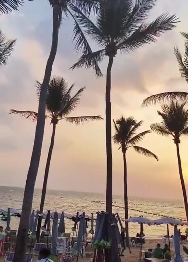 picturesque beach scene at sunset. Several tall palm trees frame the view, silhouetted against the sky. The sun, a bright orange orb, is setting over the ocean, its golden light reflecting off the water. Below the trees, the beach is populated with rows of beach umbrellas and chairs. People are visible in the background, some seated under the umbrellas and others strolling along the shore. In the foreground, a woman wearing a white shirt is standing near a table with various items on it. The overall impression is one of tranquility and relaxation, capturing the beauty of a tropical beach at sunset.