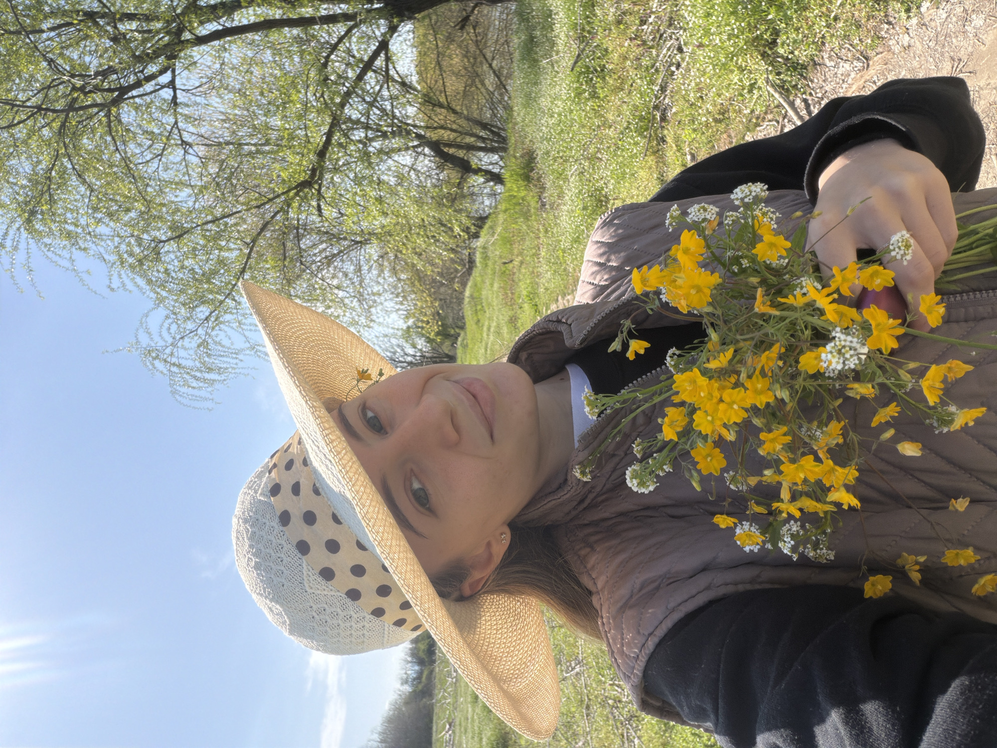 A woman holds a bouquet of yellow and white wildflowers in an outdoor setting, possibly a field. She wears a wide-brimmed sun hat with a polka dot pattern and a quilted brown jacket. The background includes trees and greenery, suggesting a rural environment. The image location is Milevo, Bulgaria.