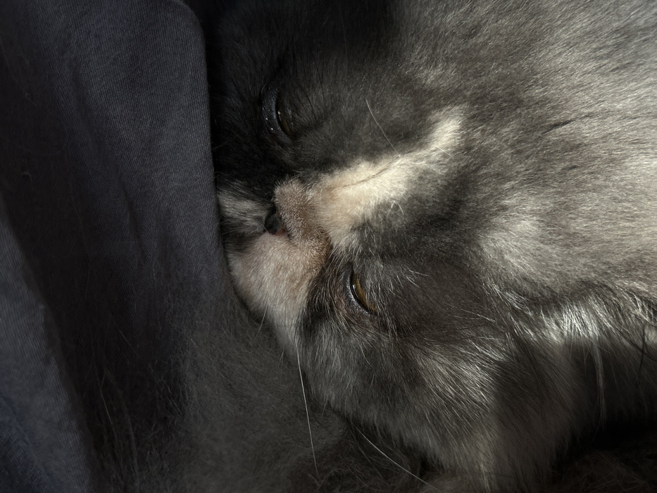 - "A close-up vertical photographic image displays the head of a domestic cat, identified as a long-haired brachycephalic breed, in a state of rest or sleep" by FM-Fca8Z2, licensed under CC BY 4.0