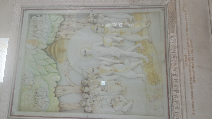 A framed, bas-relief sculpture, likely crafted from white marble or a similar stone, depicts a religious or mythological narrative scene. The panel is rectangular, with subtle coloration applied to elements like foliage (pale green), ground patterns, and a hanging bell (pale yellow/gold). The central subject is a standing male figure, depicted bare-chested with a dhoti-like lower garment, facing right and walking forward. A large, plain white circular halo or aureole is behind his head. To his immediate left (viewer's left), another male figure, richly adorned with a crown and jewelry, also walks right, carrying a peacock on his left shoulder. To the central figure's right, a third male figure, similarly adorned, walks right. On the far left of the panel, a group of approximately eight figures, including adults and at least two children, observe the central procession. Some stand with hands clasped in prayer, while one figure kneels. On the far right, a smaller group of figures, partially obscured, also stand as observers. In the upper left and right corners of the carving, small clusters of cloud-borne figures are depicted. The background features stylized trees with pale green leaves on the left and right. A prominent, ornate bell-like object, colored pale yellow, hangs from a tree branch in the upper center. The ground beneath the main figures exhibits stylized circular patterns, suggesting offerings or decorative elements, accented with pale yellow. The entire carved panel is enclosed within an ornate, white stone frame, possibly marble, featuring carved motifs. Below the carving, on the plinth, Devanagari script is inscribed. The scene is located in Katwaldih, India.