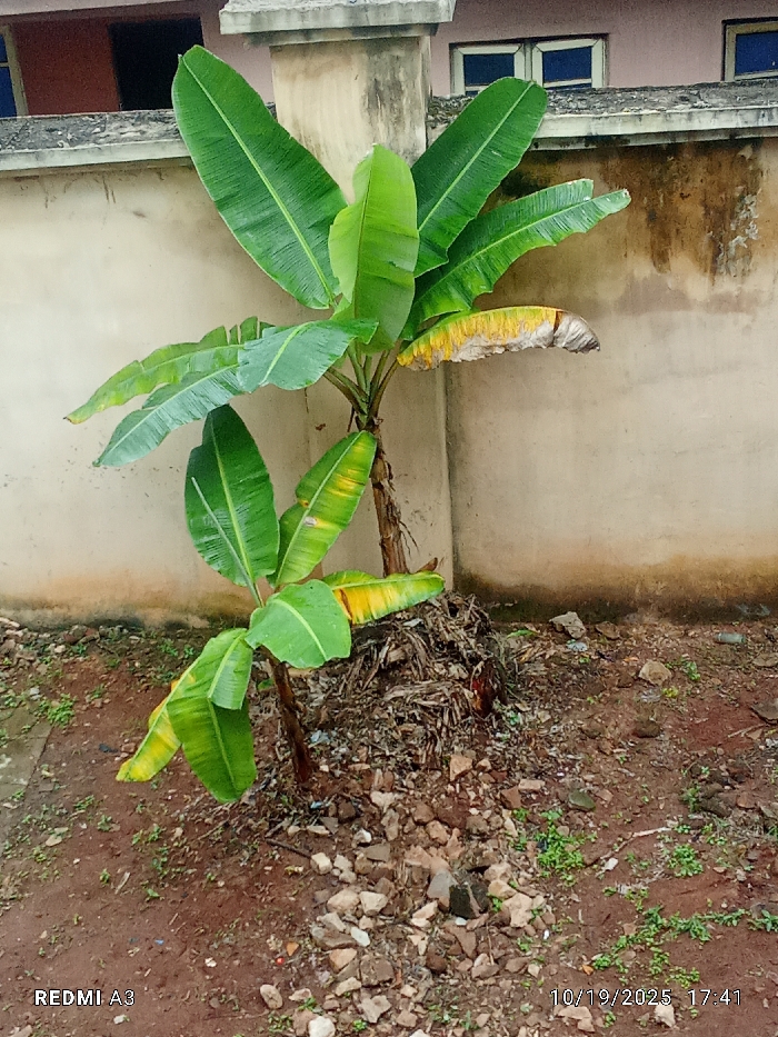 This image depicts an outdoor scene in the city of Unknown, Unknown, featuring a banana plant positioned against a building wall. The central subject is a multi-stemmed banana plant (Musa species) with numerous large, green leaves. Some leaves exhibit yellowing and browning at their tips and edges. The plant's base is surrounded by accumulated dried leaves and organic debris. Behind the plant, a light-colored, possibly concrete, wall with visible weathering, stains, and discoloration near its base extends across the frame. A darker coping or ledge runs along the top of this wall. Above the wall, a portion of a pinkish-colored building is visible, featuring at least two windows with white frames and dark panes. The ground in the foreground and around the plant consists of reddish-brown soil, mixed with a significant quantity of scattered light-colored rocks and sparse patches of small green vegetation. No individuals or animals are present. The scene is illuminated by natural daylight. A timestamp of "10/19/2025 17:41" is visible in the lower right, and "REDMI A3" is watermarked in the lower left.