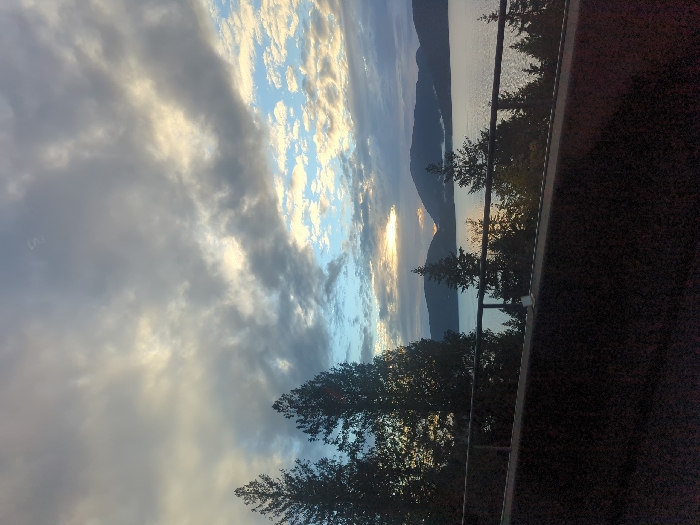 An elevated landscape view captures a body of water, mountains, and evergreen forests, consistent with the West Vancouver, Canada, region. The foreground consists of a dark, textured wall topped by a black metal railing with vertical balusters, extending horizontally across the frame. A small white rectangular object rests on the wall, left of center. The midground is dominated by a calm body of water, flanked by dark coniferous trees on its shores and on the lower slopes of distant mountains. The sky is largely overcast with grey clouds, interspersed with patches of lighter blue and illuminated areas. A bright, low-lying sun or setting sun is visible on the horizon, partially obscured by clouds and mountains, creating a golden reflection on the water below. No individuals or specific actions are depicted.