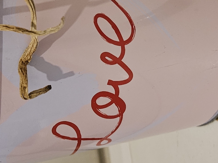 This image depicts a close-up of a light pink container, likely a bucket or pot, against an out-of-focus, light-colored background. The container's surface features the word "Love" written in a stylized red cursive script, centered on its visible portion. Above the text, a segment of a twisted, dry, light brown twine or rope, appearing to be part of a handle, extends across the upper area, casting a faint shadow on the container. The container shows minor surface wear, including faint vertical scratches and small dark specks. Faint, diffuse white patterns are visible on the upper left of the container. No people are present, and no specific location within Villeneuve-Saint-Georges, France, is discernible from the visual evidence of the object itself; the image solely focuses on the described item.