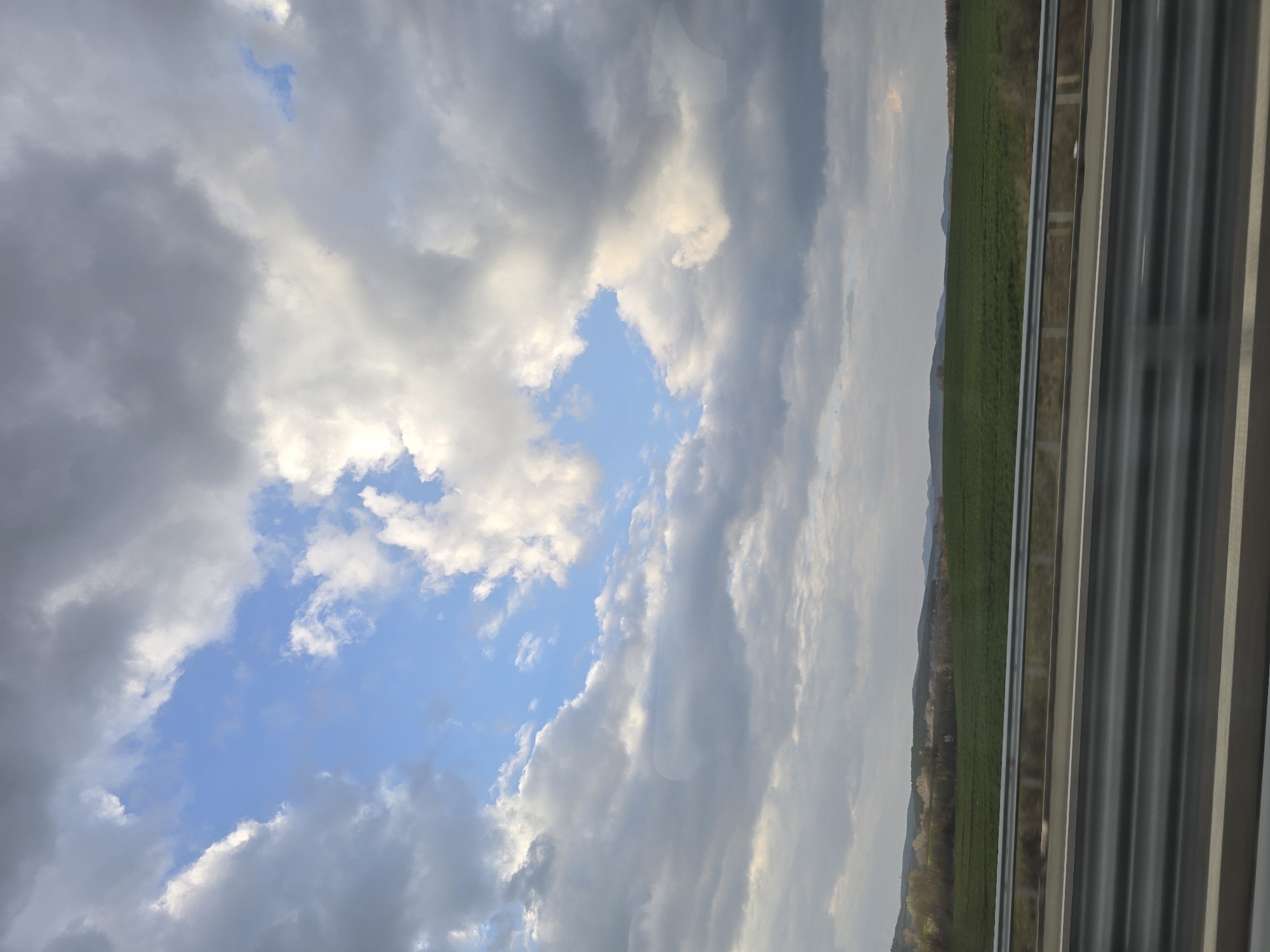 The image displays a rural landscape, observed from a moving vehicle on a highway in Yazdach, Bulgaria. The foreground features a three-tier galvanized steel highway guardrail positioned horizontally across the lower third of the frame, with a section of dark grey asphalt road visible beneath it. Beyond the guardrail, an expansive green field stretches across the midground. A line of trees or shrubs with light-colored, possibly flowering foliage, borders the field further back. In the background, a series of undulating hills or low mountains are visible. The sky occupies the upper two-thirds of the image, dominated by a mix of light grey and white stratocumulus clouds. Irregular patches of clear, light blue sky are discernible, particularly in the upper-left and central-right areas. No people, active subjects, or discernible interactions are present. The scene is illuminated by diffused natural daylight.