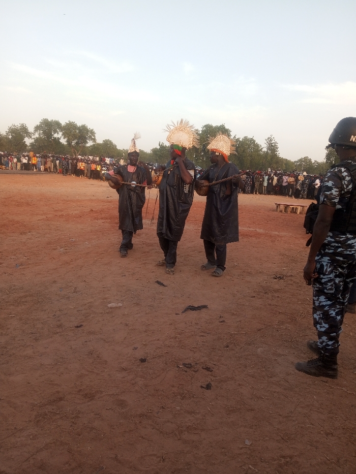Three musicians in dark robes and straw headdresses play instruments in a dirt field. A crowd of people watches from a distance. A police officer in camouflage stands guard to the right. The sky is overcast, suggesting it may be late afternoon or early morning. Trees line the horizon behind the crowd.