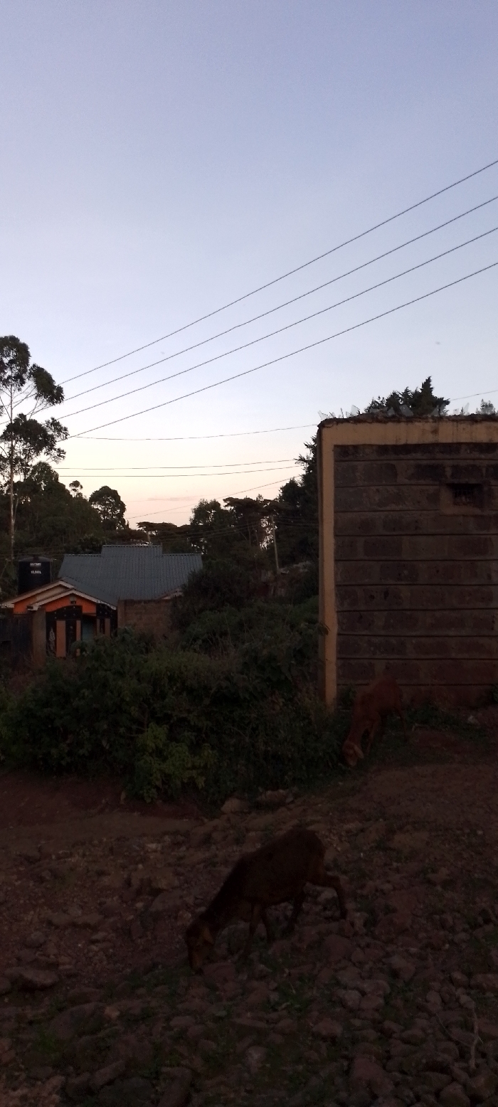 At dusk, a rural scene unfolds with a weathered, unpainted block building standing next to dense green bushes. Power lines stretch across a muted, pastel-colored sky. In the background, glimpses of rooftops and trees appear. In the foreground, two goats are grazing among the dark, rocky terrain, partially obscured by shadow.