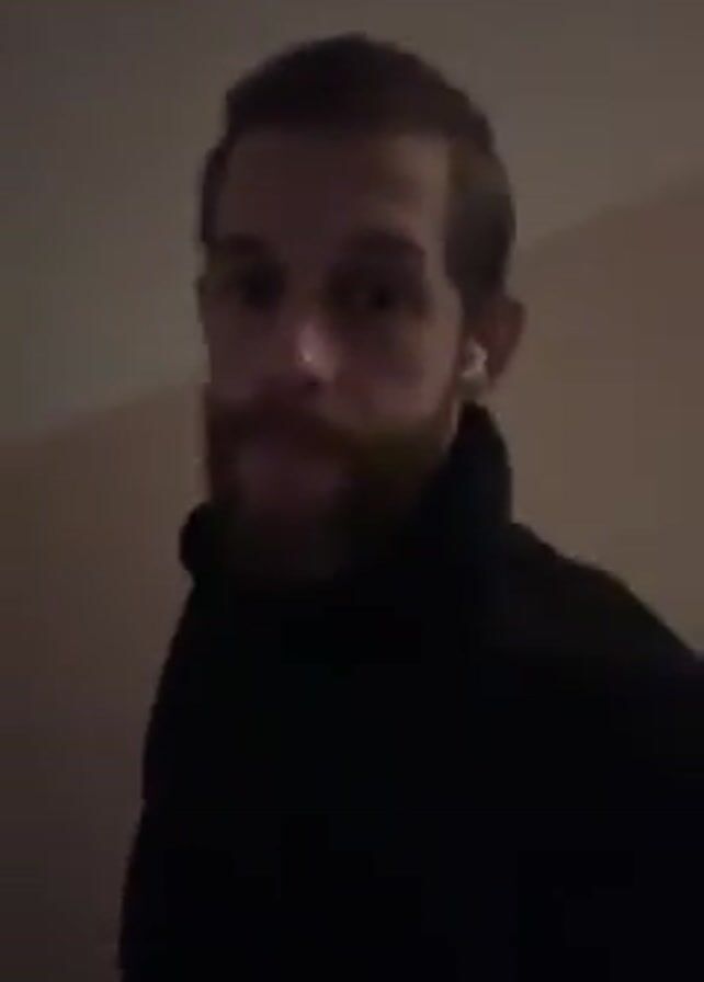 A man with a beard and short hair is walking inside. He is wearing a black zip-up sweater and a white wireless earbud in his right ear. The wall is light beige on top and blue on the bottom. The video is shaky and slightly out of focus.