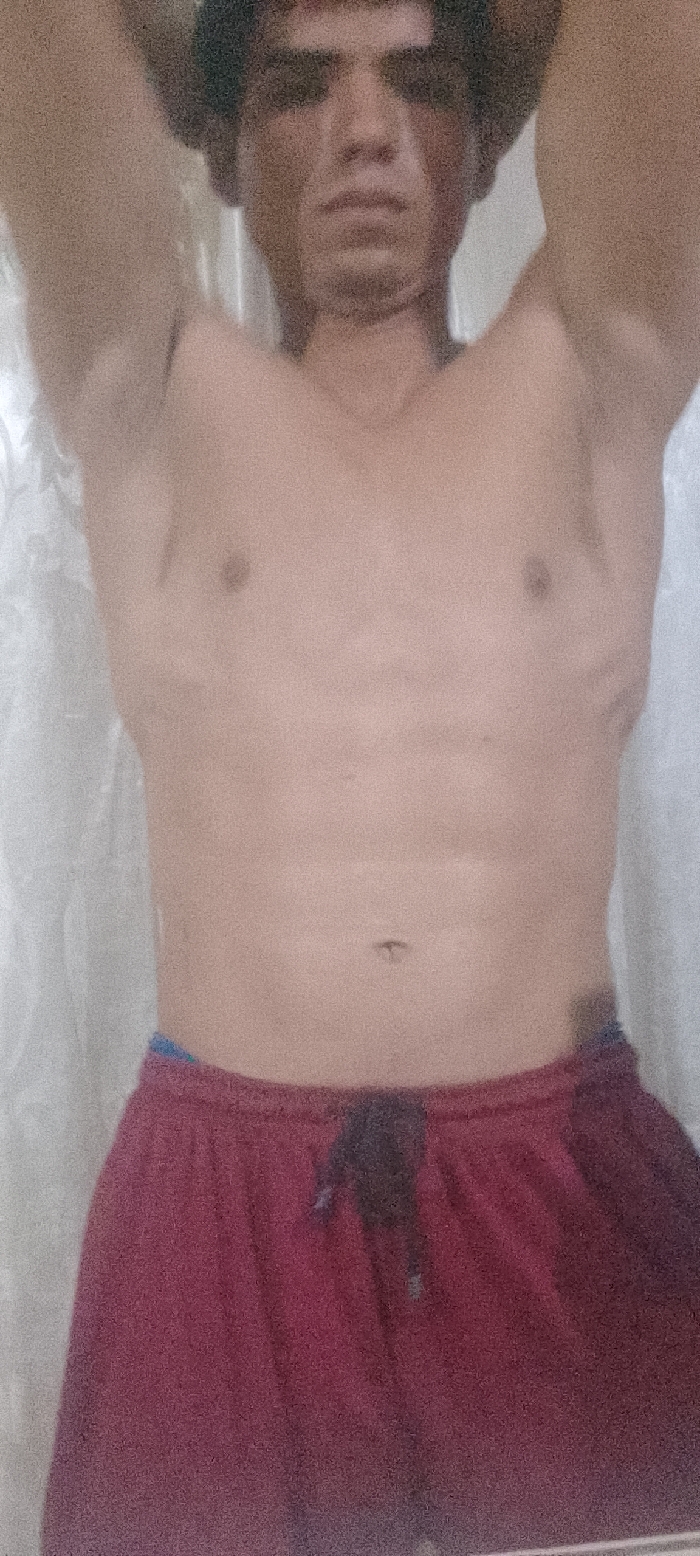An individual is depicted in an unspecified indoor location in Juan Griego, Venezuela. The subject is a male, appearing to be an adult, with a medium skin tone and short, dark hair. He is shirtless, displaying a muscular physique, and wears dark red athletic shorts or sweatpants with a visible dark blue elastic waistband and a dark drawstring. The subject stands facing forward, with both arms raised overhead, bent at the elbows, and hands positioned behind the head, indicative of a posed stance. His chest and abdominal area show defined musculature. The face is partially obscured by shadows and image grain, rendering precise facial feature identification difficult. The background consists of a light-colored, vertically textured surface, likely a wall or curtain. The overall image is grainy.