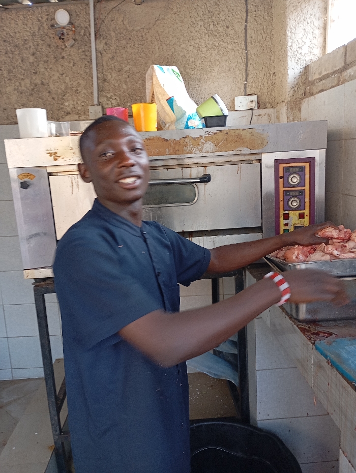 An adult male stands in a food preparation area, likely within a commercial kitchen in Jos, Nigeria