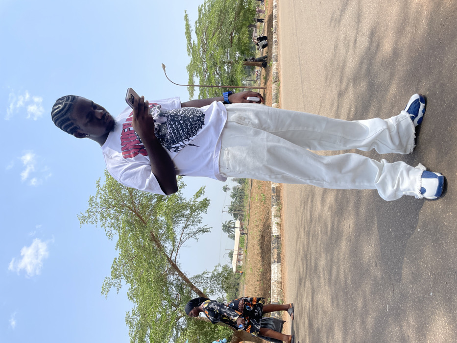 The scene depicts an outdoor environment, purportedly in the city of Ogbogbo, Nigeria, on a clear, sunny day. The primary subject is a male with dark skin and braided hair, styled in cornrows, standing on a paved asphalt surface. He wears a white short-sleeve t-shirt featuring red text ("UNDEFEATED") and a black and white graphic print, white wide-leg pants that stack at the ankles, and blue and white athletic shoes with distressed cuffs. A blue digital wristwatch is visible on his left wrist. He is actively looking down at and interacting with a silver-colored smartphone held in both hands. In the mid-ground to the left, a female with dark skin is partially visible, facing away from the camera and looking to her left. She wears a long-sleeved, dark-patterned dress with orange and blue elements and a dark head covering, appearing to walk. Behind the paved surface, a concrete curb separates the road from a patch of dry, light brown ground with green trees. In the far background, additional green trees and what appears to be a light-colored building are visible. Further to the right in the background, several individuals are gathered or seated under trees. The sky is bright blue with scattered white cumulus clouds.