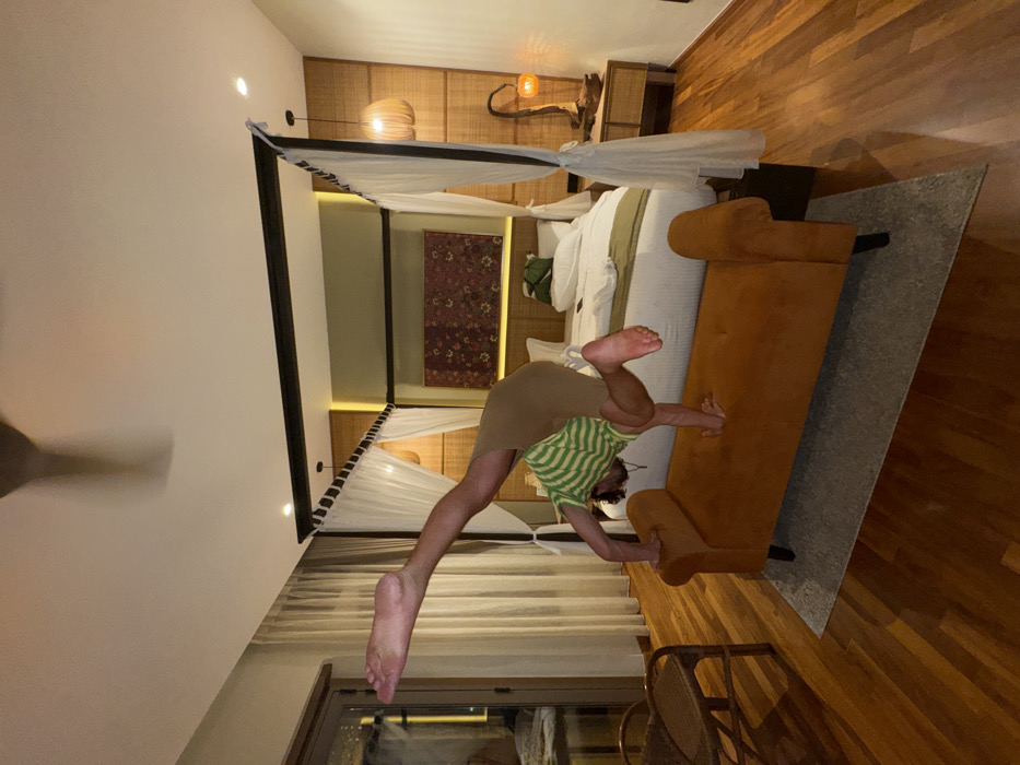 This image depicts a hotel room in George Town, Malaysia, illuminated by artificial lighting, suggesting nighttime or evening conditions. A single individual, appearing male, is performing an arm balance or handstand on an orange, tufted velvet bench in the foreground. The individual is barefoot, wearing a green and white striped short-sleeved t-shirt and light brown shorts. Their hands are placed on the bench, which rests on a light grey rectangular rug. The individual's body is inverted, with the right leg extended upward and to the left, and the left leg bent at the knee. Behind the individual, a large four-poster bed with a dark frame and white sheer canopy drapes is centrally positioned. The bed features white bedding and a green bed runner; pillows and a green bag are visible on the mattress. Centered above the headboard is a rectangular artwork displaying red floral patterns on a dark background, mounted within a muted green wall panel flanked by light wood paneling. To the right of the bed, a woven rattan nightstand supports a lamp with a sculptural wooden base and an amber glass shade. Two woven pendant lights hang from the ceiling, one on each side of the bed. The room's floor is polished dark wood. On the left side, a glass sliding door or large window with white curtains shows a dark exterior reflection, and a wicker chair is partially visible adjacent to it. A brown ceiling fan with blurred blades, indicating motion, is visible overhead, along with recessed ceiling lights.