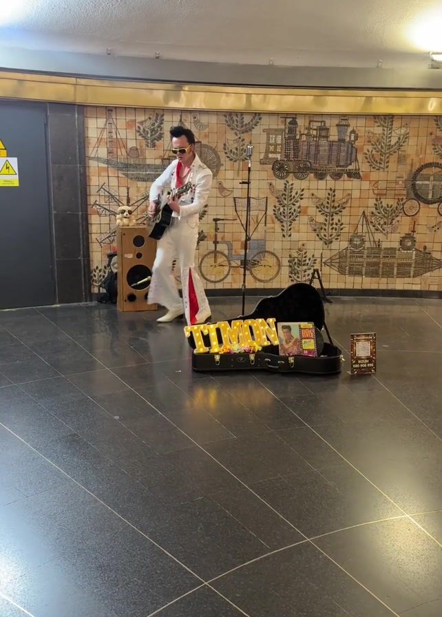 - "man dressed as Elvis Presley playing guitar in a subway station" by FM-dunNm2, licensed under CC BY 4.0