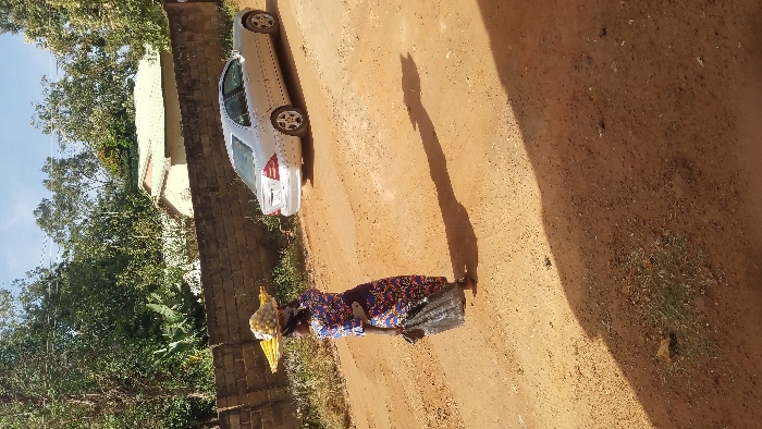 The image depicts an outdoor street scene in Jos, Nigeria, under bright daylight conditions. An adult female is positioned in the left foreground, walking towards the right on an unpaved, reddish-brown dirt road. She is dressed in a long, full-sleeved dress with a multi-colored pattern and carries a large, circular, woven tray on her head, which is piled high with numerous light-colored cobs, consistent with corn. A dark, possibly black, bag or fabric is held in her left hand. Her shadow extends long and diagonally across the dirt road. To the right, a silver Mercedes-Benz C-Class sedan (W203 generation) is parked facing right on the same unpaved surface. In the background, a low concrete block wall separates the road from an area with dense green foliage, including tall trees and bushes. Behind the foliage, a single-story building with a light green, possibly corrugated metal, roof is visible. Overhead utility lines are present against a light blue sky.