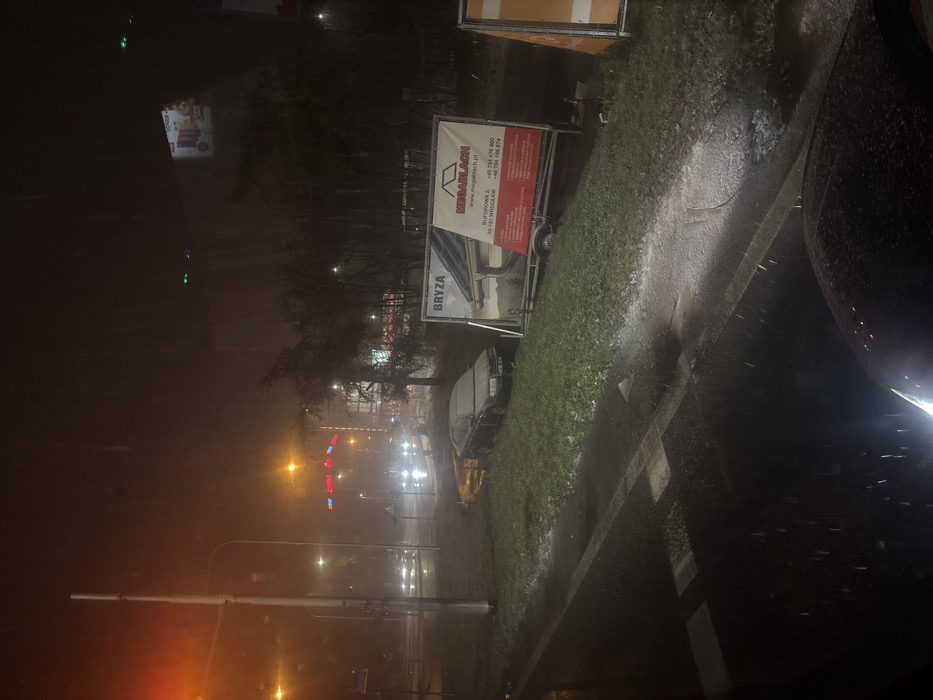 A roadside view at night during rain. A trailer displays "MEGABLACH" and "BRYZA," along with a website and phone numbers. Cars pass on the road with illuminated headlights. Streetlights and signs are visible in the distance. The ground is wet, and the camera is partially obscured by a car. A billboard stands further away.