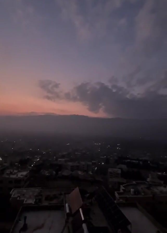 cityscape at dusk. The sky is a mix of purple, blue, and peach, with clouds scattered throughout. Below, the city is dimly lit with scattered lights. Buildings of varying sizes are visible, with flat rooftops dominating the foreground. One rooftop has what appear to be solar panels. Some hills are visible on the horizon. The scene is static with no visible movement or interaction.