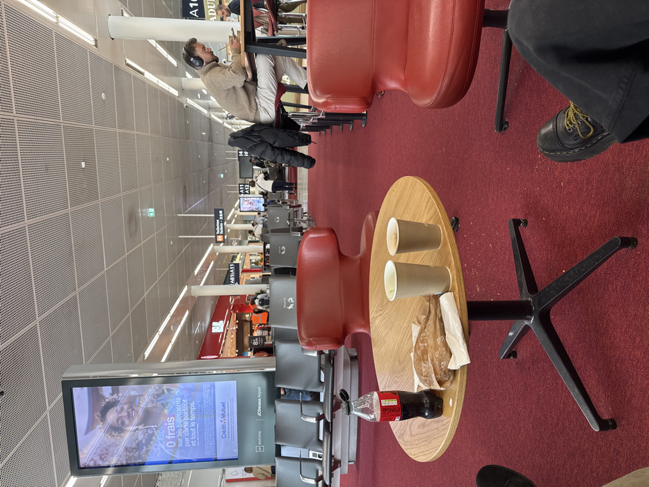 The image depicts an interior view of an airport terminal, located in Paray-Vieille-Poste, France. The scene is characterized by bright overhead artificial lighting and a pervasive red carpet flooring. In the immediate foreground, the lower legs and feet of an individual wearing black trousers and black shoes with yellow laces are visible, indicating the perspective of the photographer. A small, round, light-wood-toned table with a black four-pronged base is positioned centrally. On the table, there is a partially consumed plastic bottle of Coca-Cola with an open cap, two used light-brown paper cups (one with visible liquid residue), a brown paper bag containing a pastry or sandwich, and a crumpled white paper napkin. Crumbs are scattered on the table surface. Two red upholstered armchairs are visible; one behind the table to the left and another to the right. In the midground, to the left, a tall, vertical digital advertising screen displays an advertisement for "Crédit Mutuel" featuring a smiling woman and French text related to card payments. Adjacent to this, rows of grey multi-seater airport benches are arranged. Further right, a man with headphones sits at a high communal table, wearing a light-brown knitted sweater and light trousers, consuming food from a bowl while looking at a small electronic device. A black puffer jacket is draped over the back of his chair. Another individual is partially visible sitting to his right at the same table. The background shows additional seating areas, various commercial establishments including a store with a red facade, and overhead directional signage indicating gate numbers (e.g., A10, A11, A12, A16) and "Toilettes / Toilets" in French and English. Several other indistinct individuals are visible moving or waiting in the distance. The ceiling features white perforated acoustic panels with integrated rectangular fluorescent light fixtures. White structural columns are intermittently present.