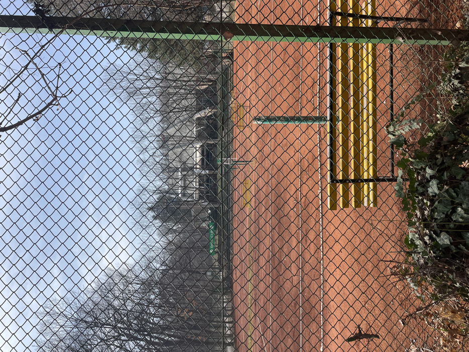 - "The image displays an unoccupied red clay tennis court viewed from an elevated perspective through a diamond-patterned chain-link fence in the foreground" by FM-ZyjlF2, licensed under CC BY 4.0