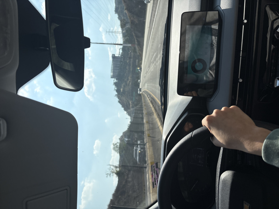 A person is driving a car on a sunny day. The road is a highway with mountainous terrain visible. The driver's hand is on the steering wheel. A rearview mirror and a digital screen are prominent in the car's interior. The sky is blue with scattered clouds. Other vehicles are seen on the road ahead. Power lines and a large building structure are on the horizon.