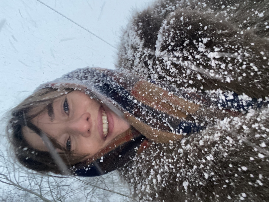 An outdoor portrait captured in Ust-Ilimsk, Russia, depicts a young adult female, seen from the chest up, smiling directly at the camera. Her face is slightly flushed, with light eyes and brown hair, including bangs visible on her forehead. She is bundled in winter attire, consisting of a brown, possibly fur or faux-fur, coat heavily dusted with distinct white snow pellets. A patterned scarf, featuring stripes or blocks of dark blue, brown, and red, is wrapped around her head and neck, framing her face. The immediate environment shows heavy snowfall, with individual snow pellets visible throughout the frame and accumulated on her outerwear. The background is a soft blur of light grey and white, with faint outlines of bare tree branches visible on the left side, indicating a winter landscape.