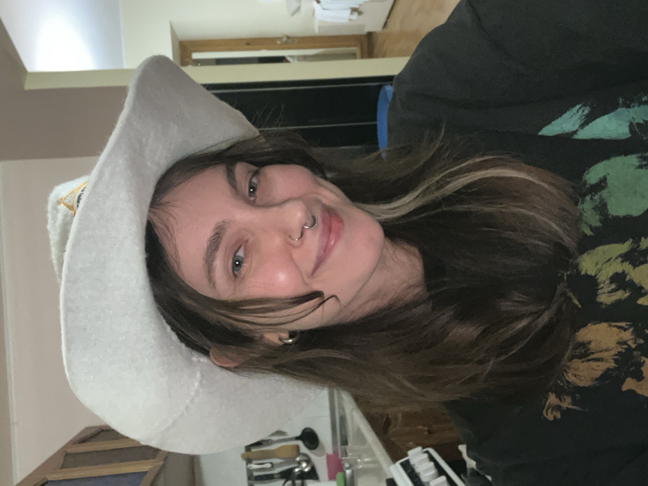 A young woman with fair skin and light eyes smiles at the camera, wearing a large, white cowboy hat. She has dark brown hair with a light blonde streak. Her nose is adorned with two piercings, and she wears a pair of hoop earrings. The woman is wearing a dark shirt with a colorful, abstract design. The background is somewhat blurred, but includes furniture and household items.