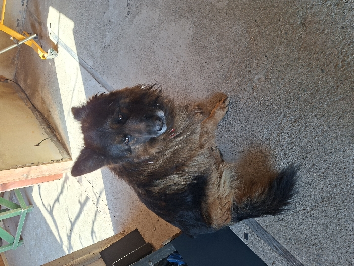 - "The scene depicts a long-haired canid, consistent with a German Shepherd or similar large breed mix, exhibiting black and tan/brindle fur, situated on a grey concrete surface" by FM-iKbEw2, licensed under CC BY 4.0