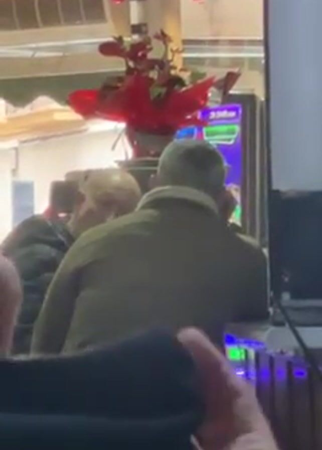 three people playing on slot machines. Two of the people are standing directly in front of the machines, while the third is partially obscured on the left. One man is bald and wearing a dark jacket, while the other has gray hair and is wearing a green jacket with a white collar. The camera is positioned behind someone, who is visible at the bottom of the frame. Christmas decorations can be seen above the slot machines.