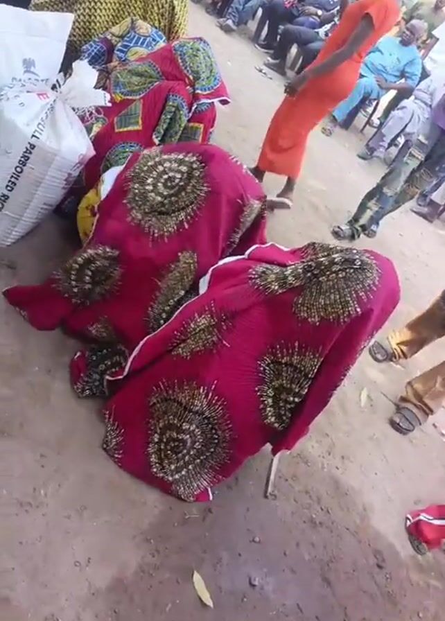 gathering of people in what appears to be an outdoor event. Several people are seated on chairs in the background. A woman in an orange dress stands among them, holding her phone up and seemingly recording. Closer to the camera, there are bags of rice and colorful piles of clothing on the ground. Two figures, possibly people, are covered in pink patterned fabric. The ground is dirt with some scattered leaves. The camera is held by someone on the ground, and the "Infinix NOTE 30 Pro" watermark is visible at the bottom. There are other people standing around, including someone who appears to be wearing military-style camouflage pants. There is music playing, judging by the sounds in the video.