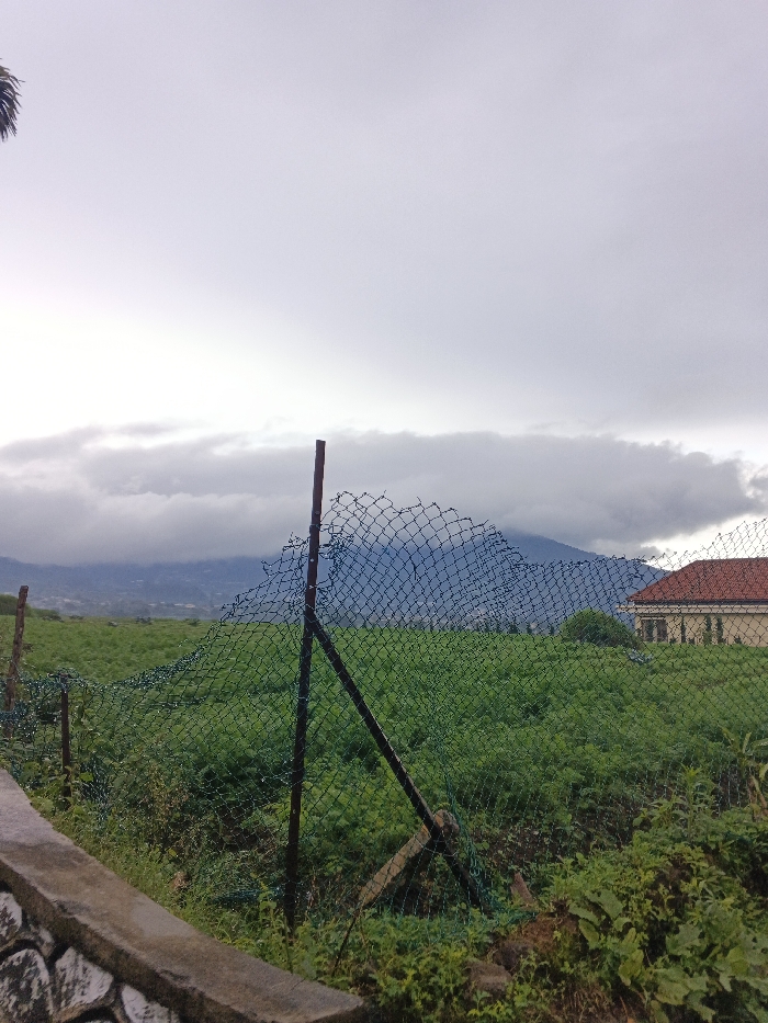 The scene depicts an outdoor landscape in Sindangjaya, Indonesia, under an overcast sky. In the immediate foreground, a concrete barrier with a patterned, possibly stone veneer, runs horizontally along the bottom left. Behind this barrier, a dark green, partially damaged chain-link fence extends across the midground, supported by multiple slender posts, one of which features a diagonal brace. Water droplets are visible on the fence and surrounding vegetation. Beyond the fence, a large field of dense, short green foliage, likely crops, occupies the central midground. To the right, partially visible behind the field, is a building with a light-colored facade and a reddish-orange tiled roof. The background features a distant mountain range obscured by thick, low-hanging grey clouds, consistent with an overcast day. No individuals or discernible actions are present.