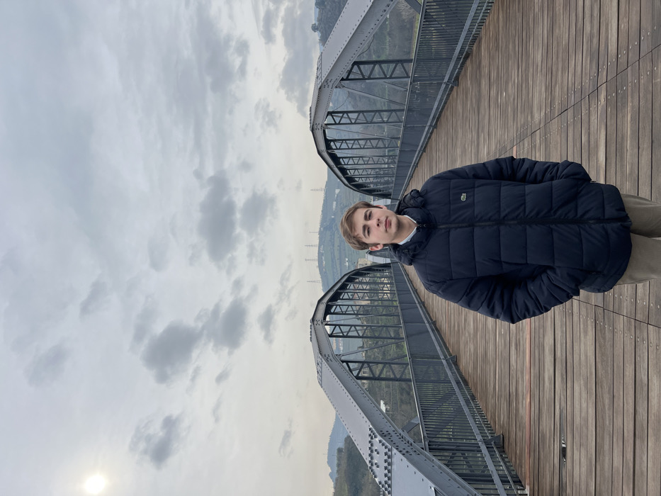 A young adult male stands centrally on the wooden deck of the metallic truss bridge, identified as the Old Road Bridge (Ponte Velha) in Peso da Régua, Portugal. He has short light brown hair and a neutral expression, looking directly forward. He is dressed in a dark navy blue puffer jacket with a visible light-colored collar underneath and a green crocodile logo on the left chest, paired with light brown trousers. His hands are in his jacket pockets. The bridge structure consists of prominent gray metal truss arches with visible rivets and supporting railings on both sides, extending into the background. Beyond the bridge, terraced green hillsides are visible, with several high-voltage power line towers present on the distant ridge to the right. The sky is heavily overcast with gray clouds, and a diffuse, bright sun is partially visible in the upper left quadrant.