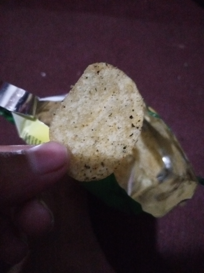 A hand holds a single potato chip in front of an opened bag. The chip is round, lightly colored, and speckled with dark seasonings. The bag appears to be green and silver on the inside. The background is a dark, blurry maroon color. The lighting is dim, obscuring details of the hand and the surroundings.