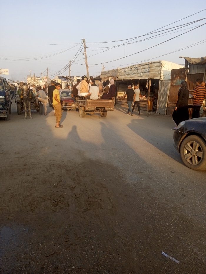 The image depicts an outdoor street scene in Al-Mawasi, Unknown, under clear sky conditions with light casting long shadows towards the viewer