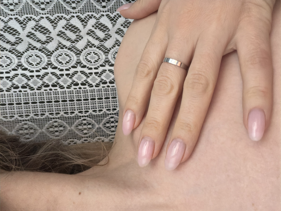 The image displays a close-up of a human upper torso and a right hand. The individual exhibits a light skin tone. Strands of light brown hair are visible near the left shoulder and neck. A small, dark brown nevus is located on the left side of the neck. The right hand rests on the upper chest and shoulder area, with fingers slightly spread. The nails are manicured, oval-shaped, and coated with a translucent, light pink or pearlescent polish. A plain, unadorned, silver-toned band ring is present on the fourth digit of the right hand. The background consists of a white lace fabric or curtain, featuring a repeating pattern of geometric motifs including diamonds and circles, set against a dark, indistinct backdrop. The specific location within Izhevsk, Russia, is not discernible from the visual information provided.