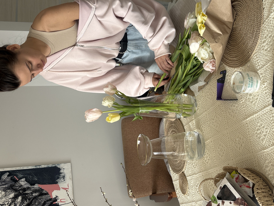 An indoor scene in Krasnoyarsk, Russia, depicts a young adult female arranging flowers at a table. The female, with dark hair tied back, wears a beige ribbed tank top, a light pink oversized zip-up hoodie with one shoulder exposed, and light blue jeans secured by a black belt. Her gaze is directed downwards as her hands manipulate green flower stems. The table is draped with a light-colored, possibly crocheted, tablecloth and features multiple circular woven placemats. Two clear glass vases are present: one tall, conical vase holds several light pink and yellow tulips in water, while another distinctively shaped vase with a wider top and narrower base also contains water. A large bundle of fresh tulips, consisting of light pink, white, and yellow blooms, partially wrapped in brown kraft paper, lies on the table. Adjacent to this, a smaller cluster of green tulip stems is observed. Other objects on the table include a small, cylindrical container labeled "МОРСКАЯ СОЛЬ ПИЩЕВАЯ" (Sea Salt Food Grade) in Cyrillic, and a purple-and-black tool. In the lower-left foreground, a woven basket contains various packaged items, including what appears to be a box of chocolates. A branch with small white blossoms extends into the frame from the left. The background wall is a plain light grey, adorned with a large abstract artwork featuring black lines and shapes on a white base, accented with a prominent pink section. A portion of a brown upholstered chair is visible on the left side of the frame, behind the table.